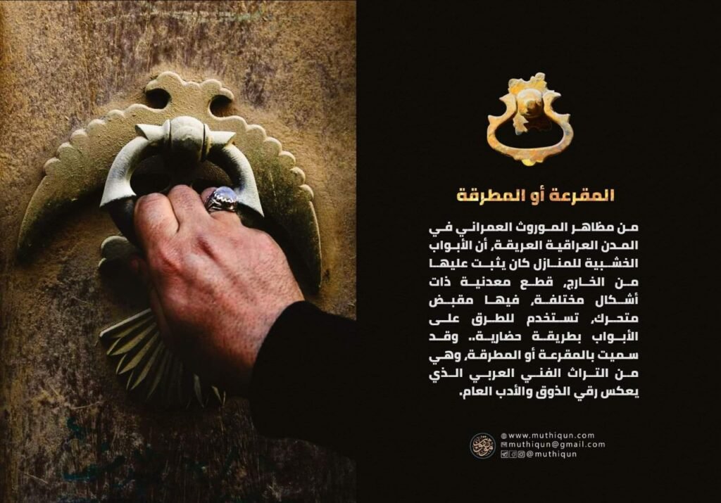 من مظاهر الموروث العمراني في المدن العراقية العريقة، أن الأبواب الخشبية للمنازل كان يثبت عليها من الخارج، قطع معدنية ذات أشكال مختلفة، فيها مقبض متحرك، تستخدم للطرق على الأبواب بطريقة حضارية.. وقد سميت بالمقرعة أو المطرقة، وهي من التراث الفني العربي الذي يعكس رقي الذوق والأدب العام.